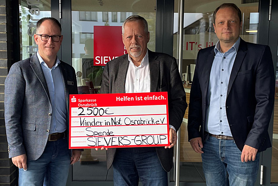 Scheckübergabe bei der SIEVERS-GROUP (v.l.n.r.: Udo Wenker, Geschäftsführer, SIEVERS-GROUP, Robert Seidler, Vorstandsvorsitzender, Kinder in Not Osnabrück e.V., Nikolai Wiesehahn, Head of Marketing, SIEVERS-GROUP)